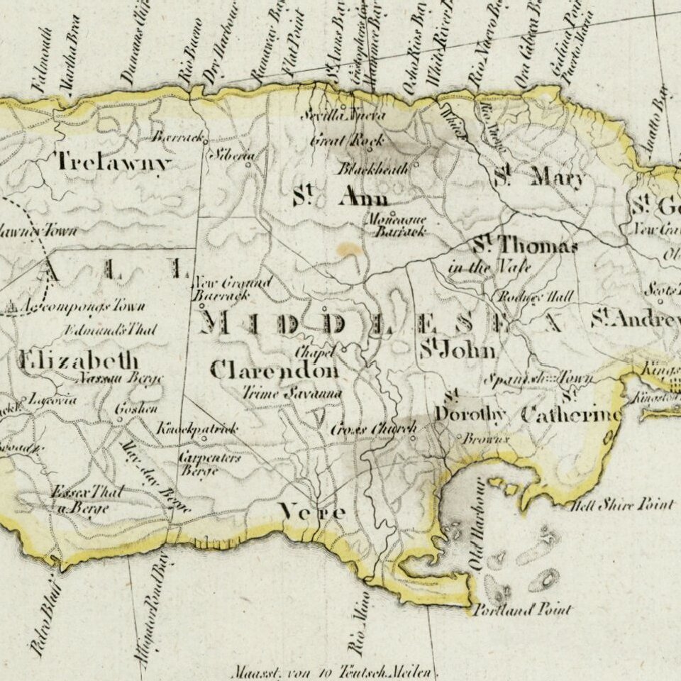 One of the earliest obtainable maps of Jamaica to locate postal roads.