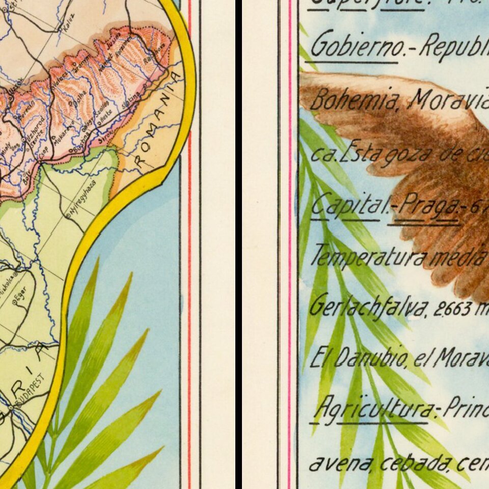 The map shows a finely illustrated map of Czechoslovakia, with a fact card superimposed over a flora motif.