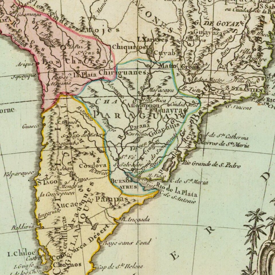 A striking map of most of South America, colored by countries. Shows a still primitive mapping of most of the interior of the continent.