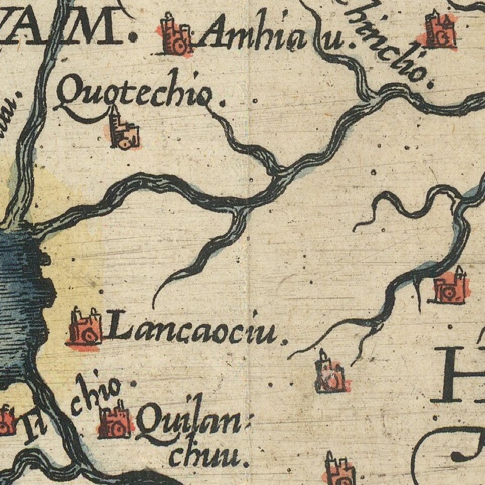 The Portuguese Jesuits established a mission in China in 1577. Although the map's Portuguese maker, Barbuda, was himself not a Jesuit, his sources for the map were Portuguese Jesuits. The Chinese characters found in the text on the verso of the map were the first introduction to Chinese language for many educated Europeans of the time.