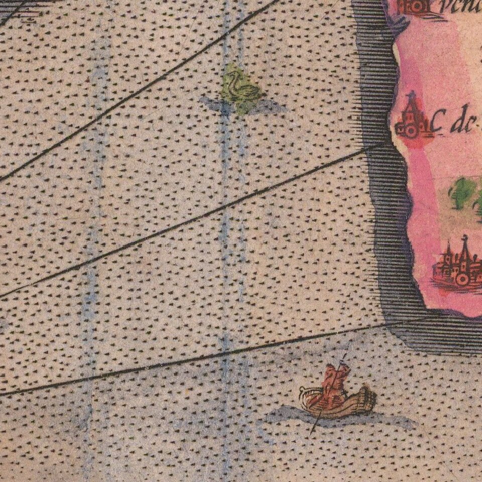 Hondius moved to London in 1584, fleeing religious persecution in Flanders. There, he worked for Richard Hakluyt and Edward Wright, among others. Hondius also engraved the globe gores for Emery Molyneux’s pair of globes in 1592; Wright plotted the coastlines. His engraving and nautical painting skills introduced him to an elite group of geographic knowledge seekers and producers, including the navigators Drake, Thomas Cavendish, and Walter Raleigh, as well as engravers like Theodor De Bry and Augustine Ryther. This network gave Hondius access to manuscript charts and descriptions which he then translated into engraved maps.