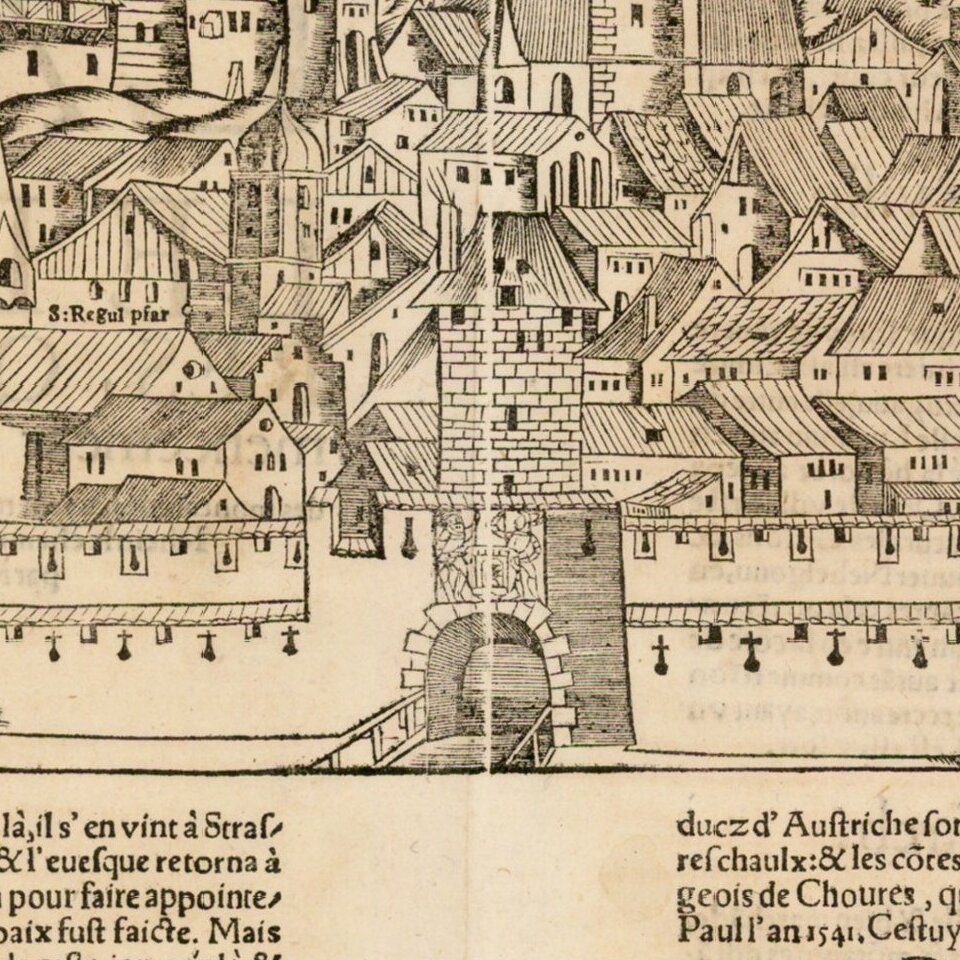 Early decorative birdseye view of Chur from a French edition of Munster's Cosmography, one of the most influential georgaphical works of the 16th Century.