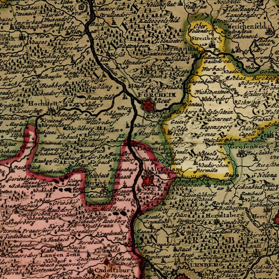 Extends from the Donau in the South (showing Regensberg, Ingolstatt and Nordlingen) to Eger, Hoff and Amberg in the East and Wurtzberg in the west.