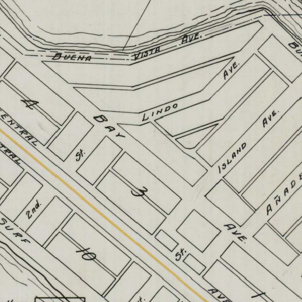 Detailed map of a portion of Newport Beach, bounded by Surf Avenue, Buena Vista Avenue, 4th Street and Alvarado Street.
