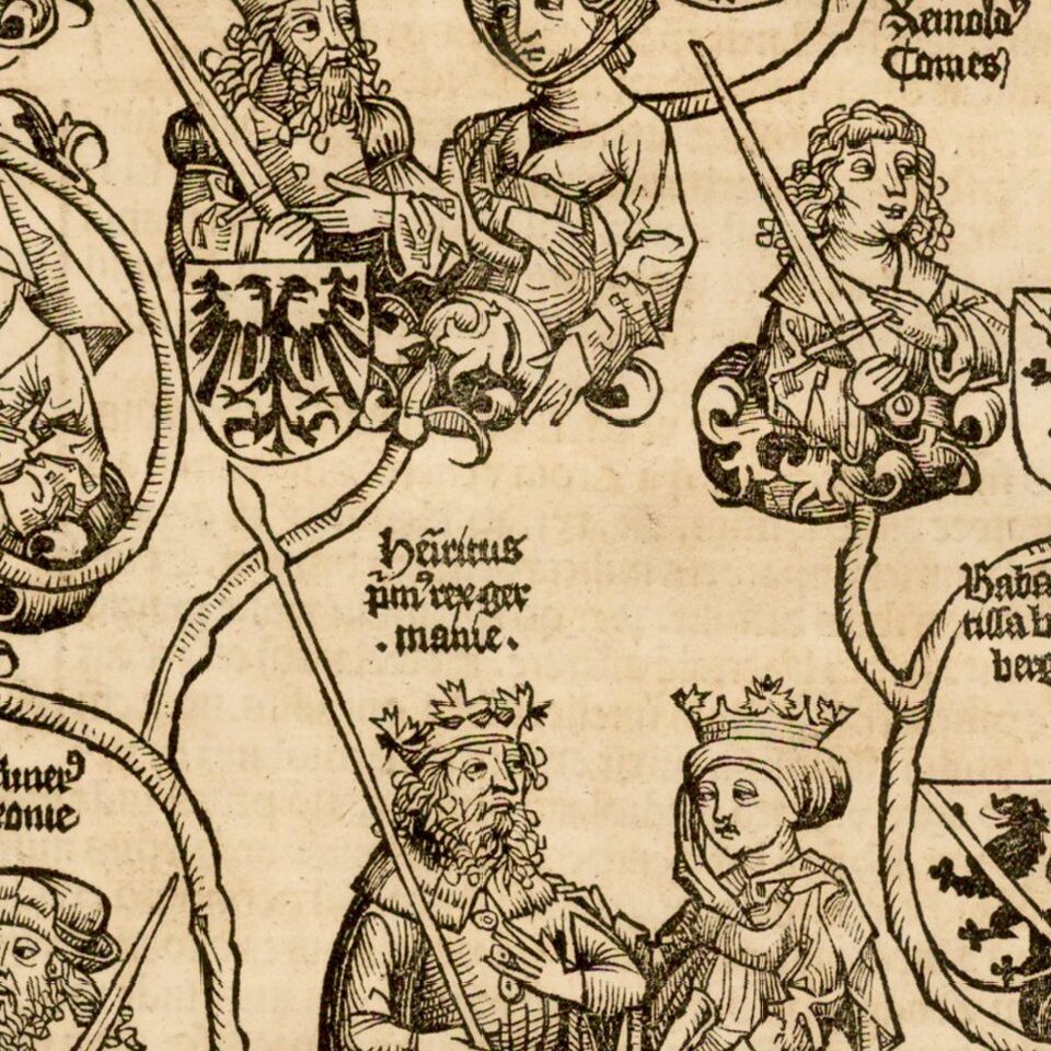 Antique woodblock from the 1493 Nuremberg Chronicle depicting the genealogy of Saint Henry The Emperor on verso. On the recto is an image of Emperor Henry II and Saint Kunigunde holding a model of a cathedral church in Bamberg that had been founded by Henry II, which became the location where he and his wife were buried. Also on recto are the portrait of Conrad the Second and images of a solar eclipse and a comet.