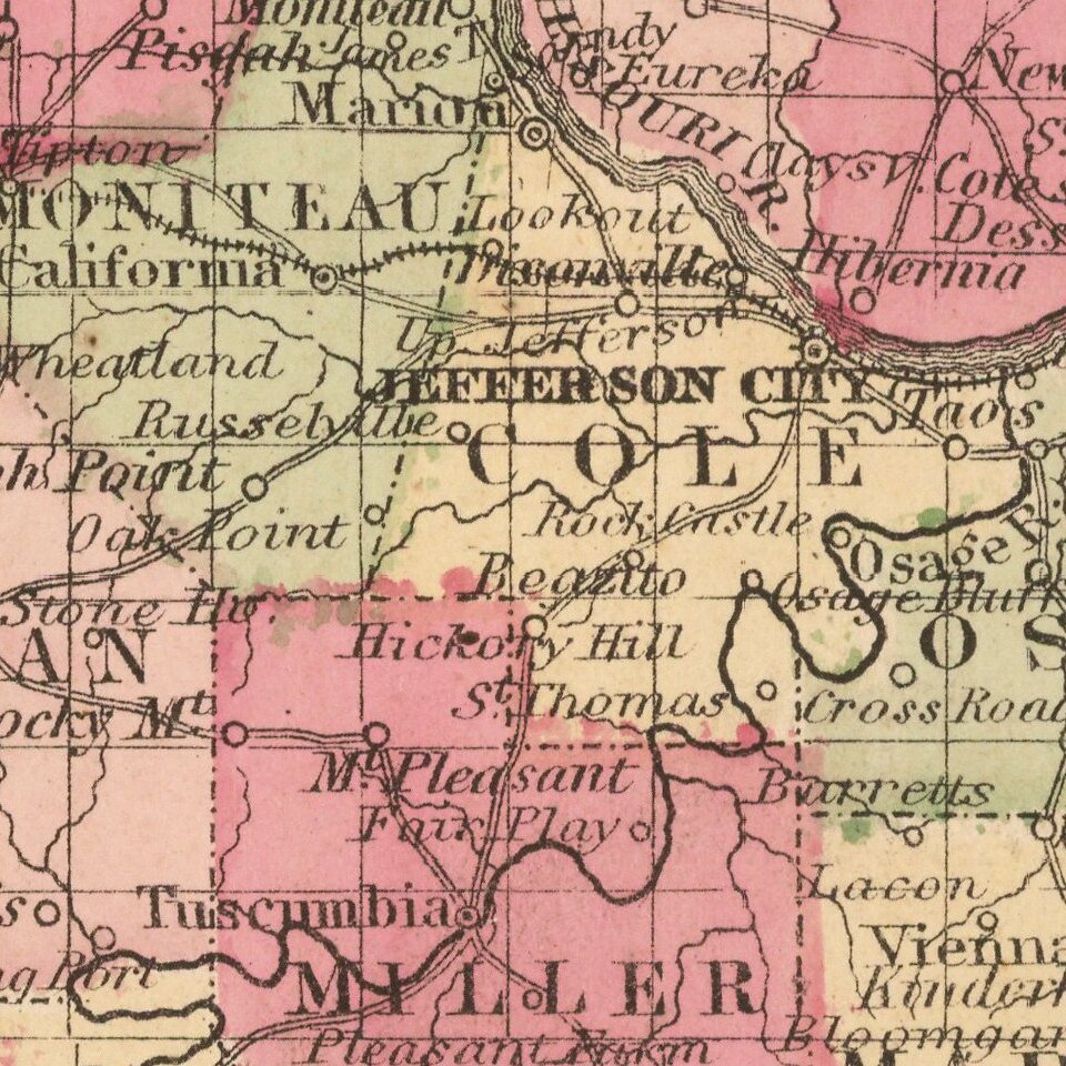 Shows roads, railroads, towns, villages, post offices, rivers, lakes, stations and a host of other details. Inset of St. Louis vicinity in upper right corner. Decorative border. A terrific map, from JH Colton, one of the most prolific American mapmakers of the mid-19th Century.
