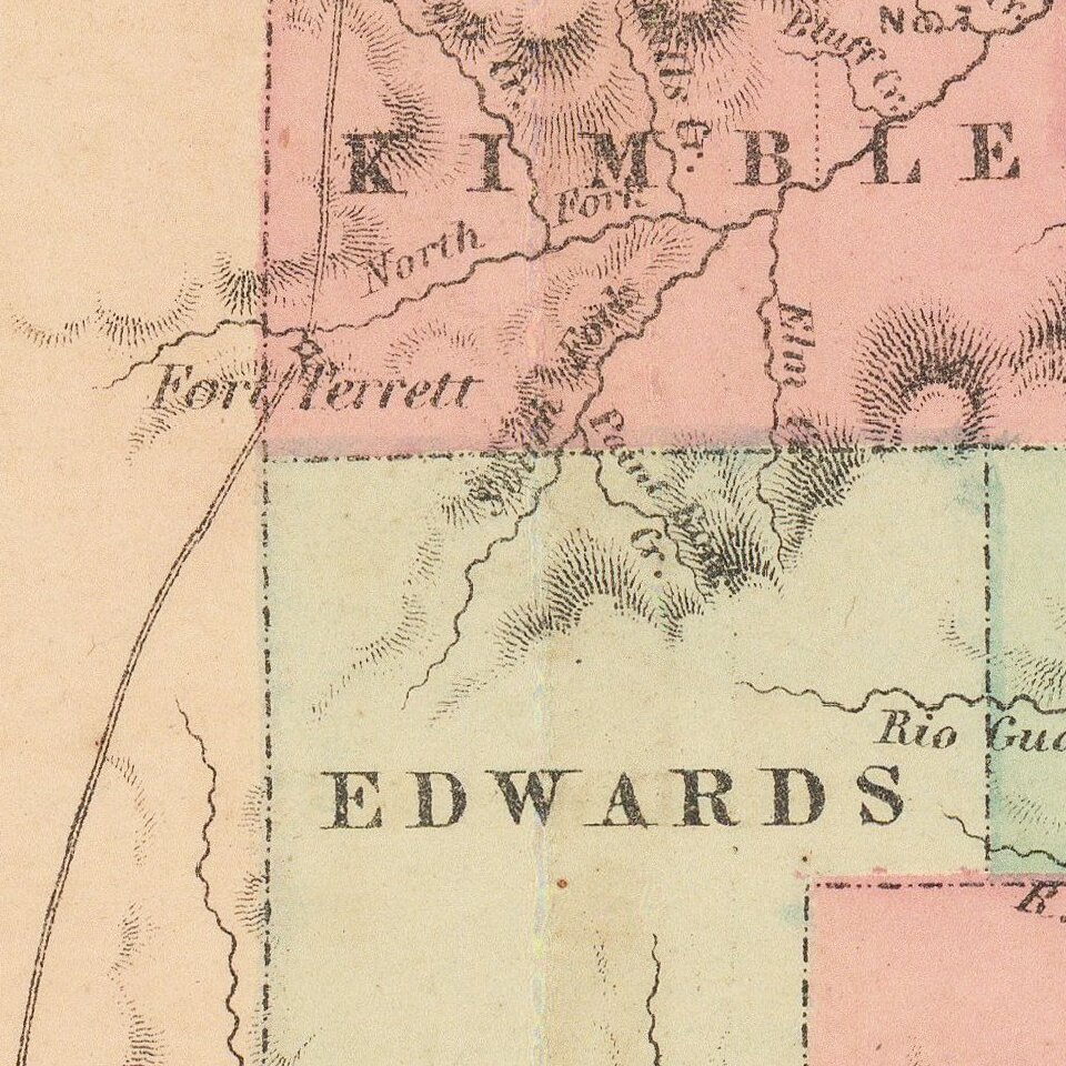 Detailed map of Texas, colored by counties and showing the primitive county configurations in the west.