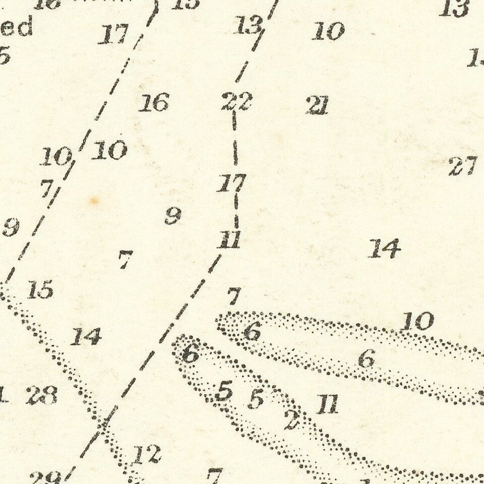 The chart lists hundreds of soundings and shoals, as well as on-shore topography.