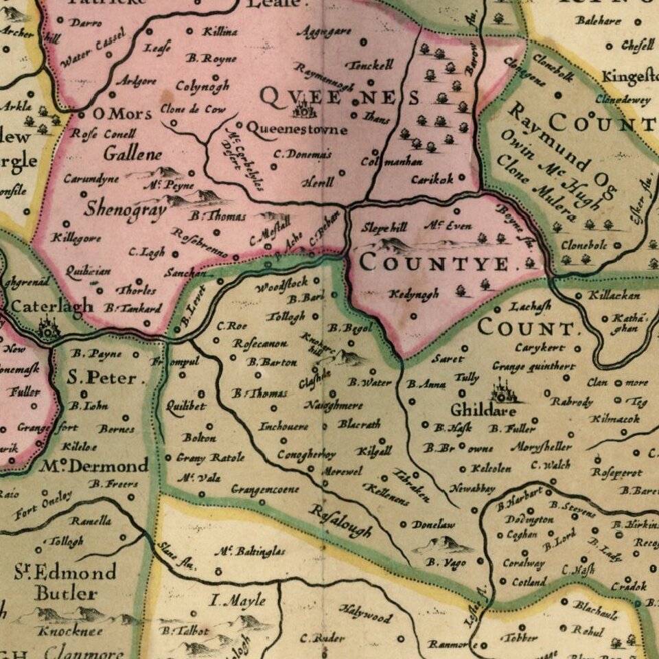 Striking old color example of Jansson's map of the County of Leinster.