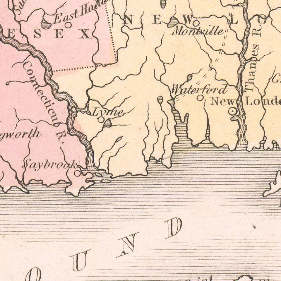 Original color example map of Connecticut and Rhode Island, from an early edition of Bradford's Comprehensive Atlas.