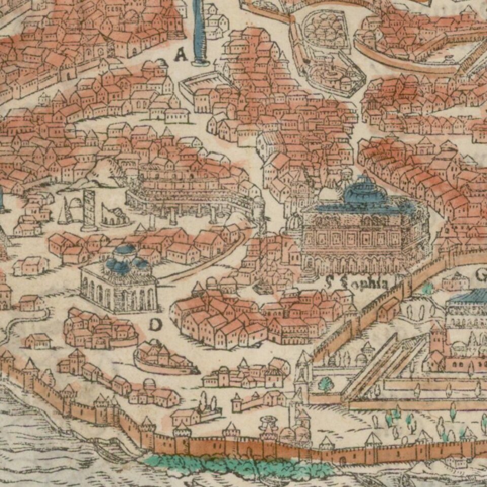 Finely colored early view of Constantinople (Istanbul), one of the earliest widely distributed views of the City from the 16th Century.