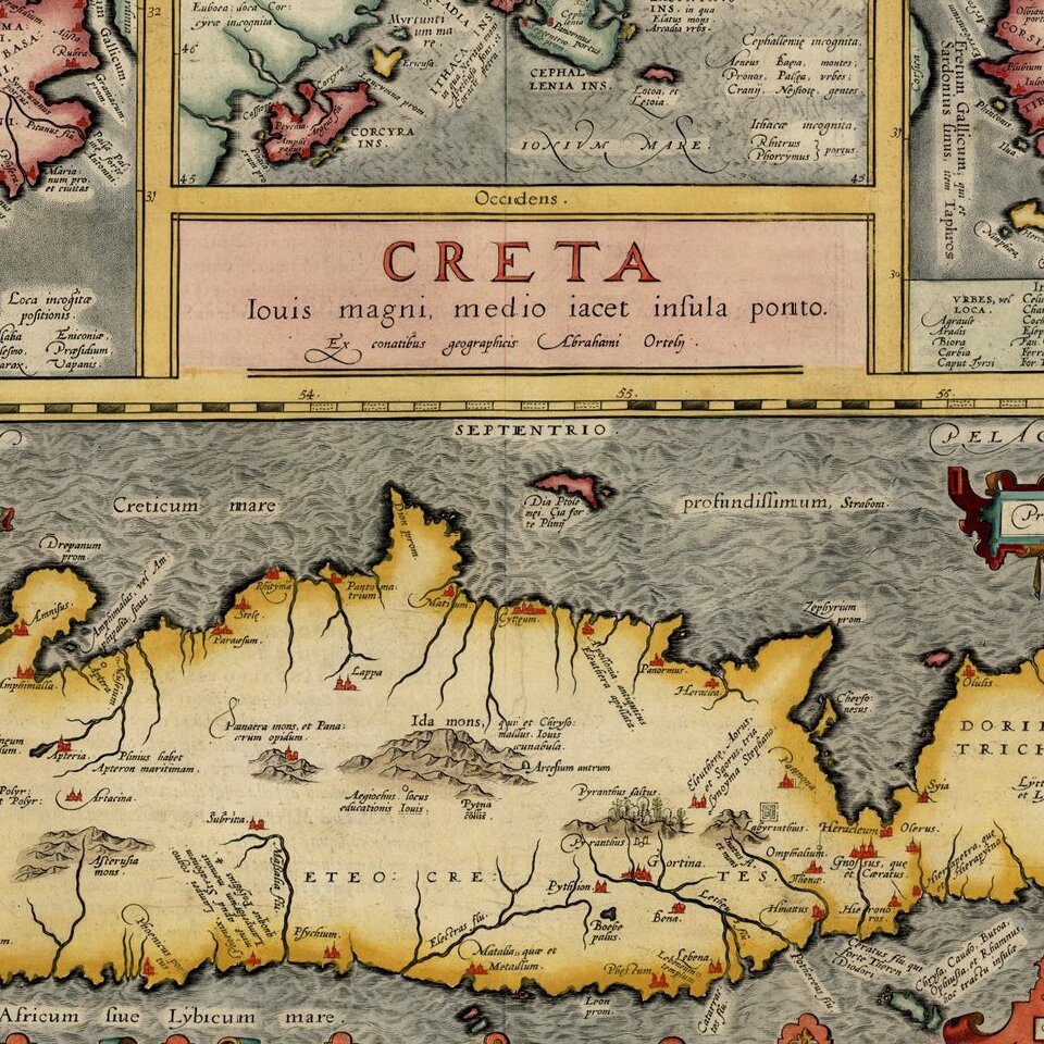 Decorative example of Ortelius' maps of Corsica, Sardinia, Crete and the Ionian Sea, from his Theatrum Orbis Terrarum, the first modern atlas of the world.