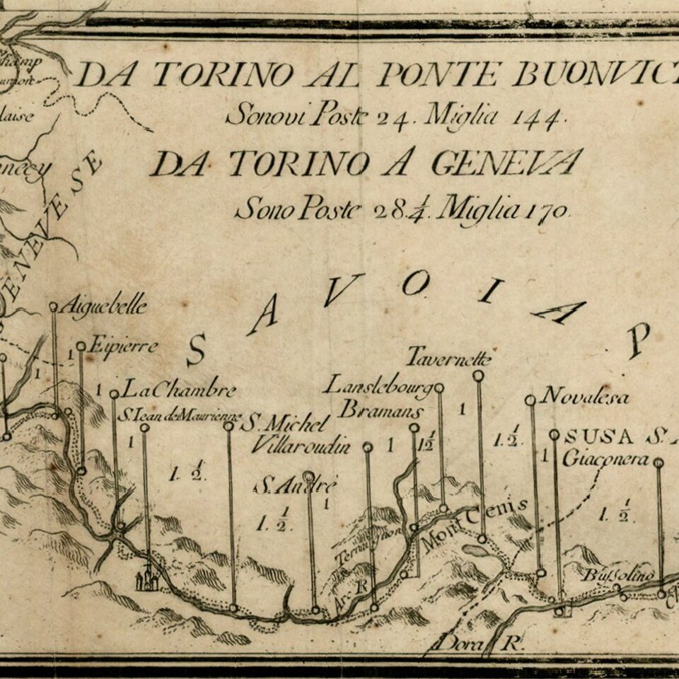 Rare postal roads map, showing the post roads from Torino to Geneva and Torino to Buonvincino.