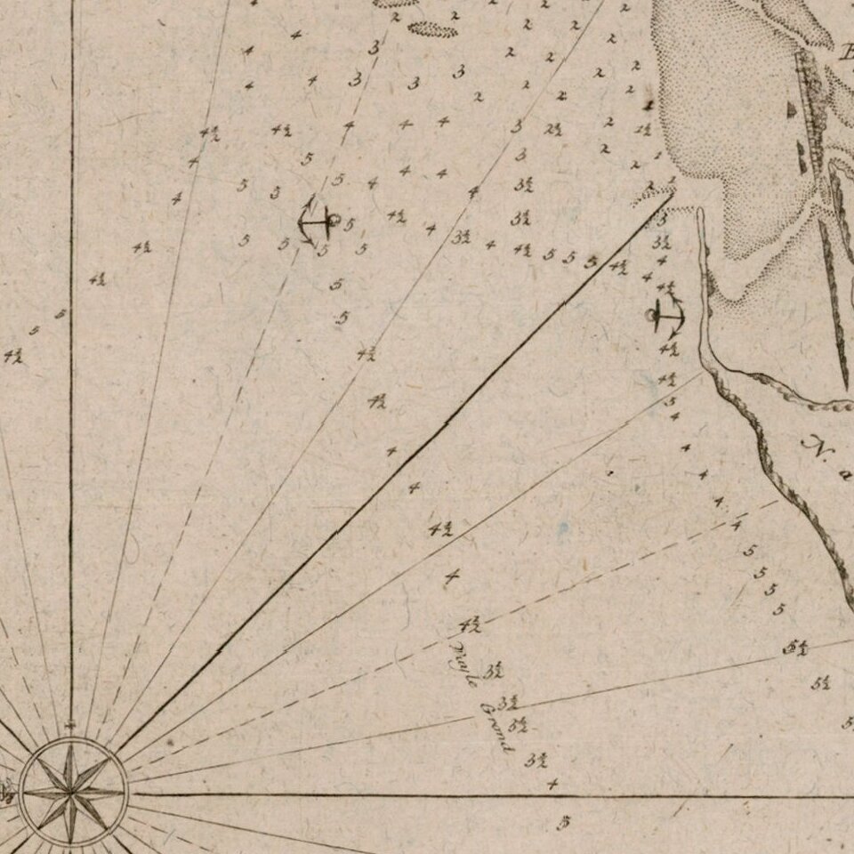 The map includes a latitude scale, compass rose and system of rhumb lines, soundings, anchorages, etc.