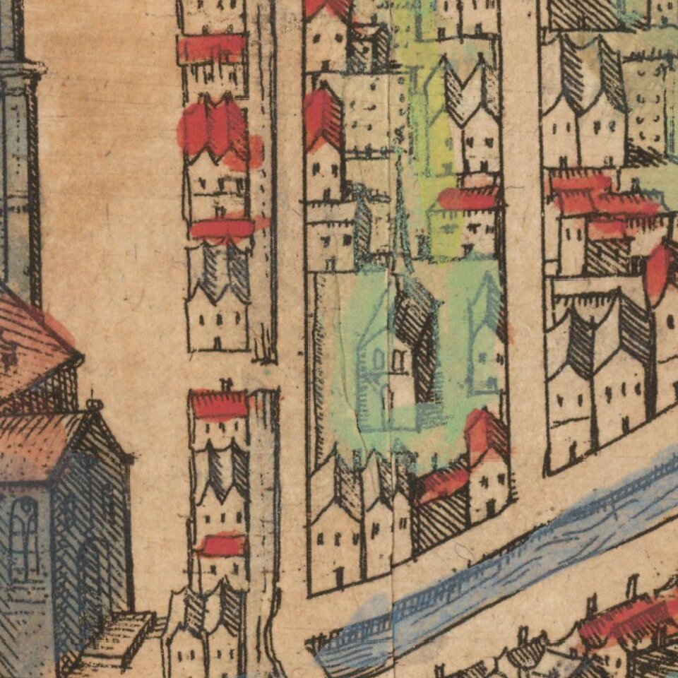 The city, criss-crossed by numerous narrow canals, is seen in a bird's-eye from the east. Its main buildings, on other hand, are presented in an impressive fashion in side view: the New Church (Nieuwe Kerck) on the market square with its enormous tower and the Gothic town hall (Das Rath huis). Granted its charter in 1246, Delft became an important centre of trade for the region. In 1618 the town hall burned to the ground and - with the exception of its prison tower Het Steen - thus no longer survives in the form illustrated here. Not far from the central market square rises the Oude Kerk, whose leaning tower, known as the "Lange Jan", has become Delft's landmark. Behind the Oude Kerk lies the convent of Sint-Agatha, today known as the Prinsenhof (Prince's Court), since William I, Prince of Orange, resided here.