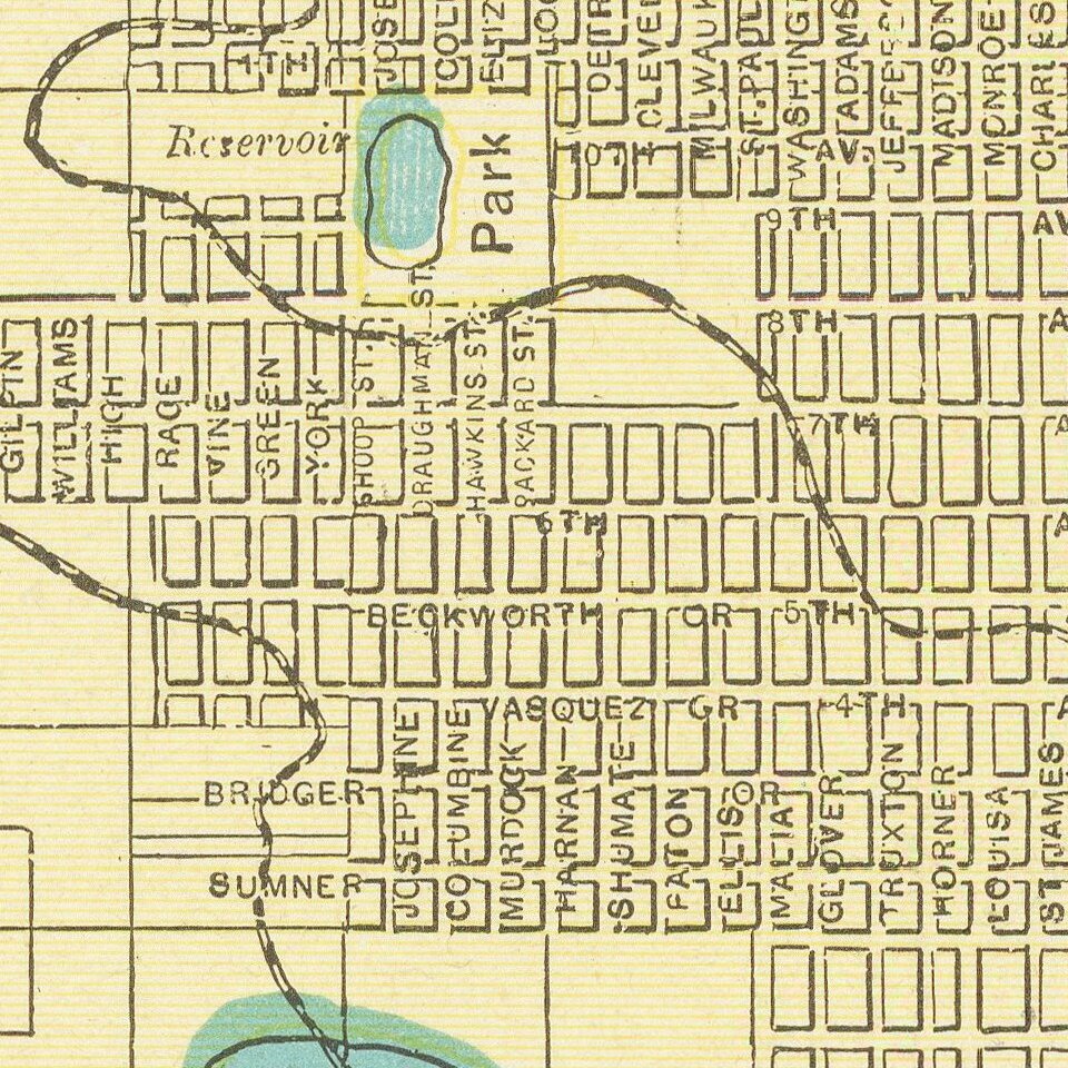 Scarce 19th-century city plan of Denver, Colorado, showing streets, buildings, train lines, public places, rivers etc.