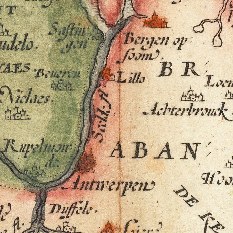 Koeman (1964) attributes this map to Jan van Hoirne's 1556 map of the Oosterscherzee, which only covers one eighth of the present map. Van der Heijden in The oldest maps of the Netherlands, Utrecht 1987, p. 20, map 14, thinks that another, unknown map by this cartographer, as mentioned in the Catalogus is more likely. Karrow (88/8, p. 619-620) attributes this map to the 1568 map of the Low Countries by Matthias Zuendt (1498-1571). Finally, Meurer (p. 91) makes a convincing case for de Jode's 12 sheet map of 1566, itself based primarily on Jacob van Deventer's province maps.