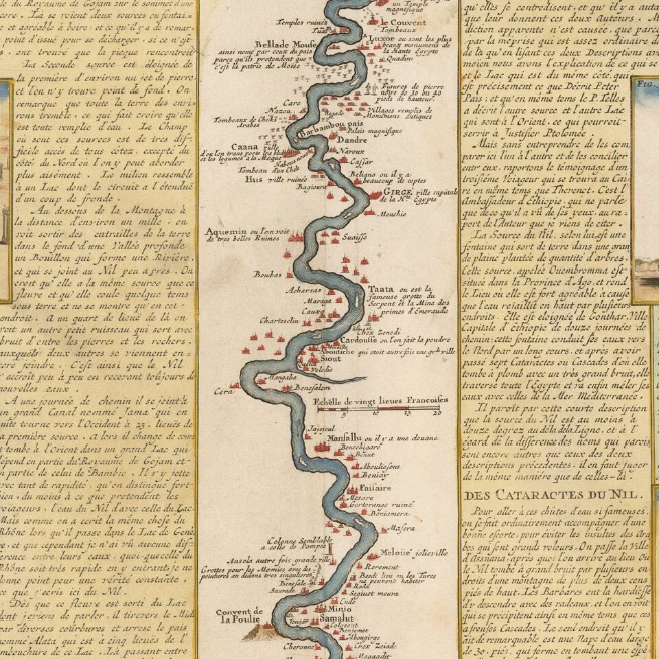 Detailed map of the course of the Nile, from the cataracts of the Nile at the south (top of the image) to Cairo and Giza.