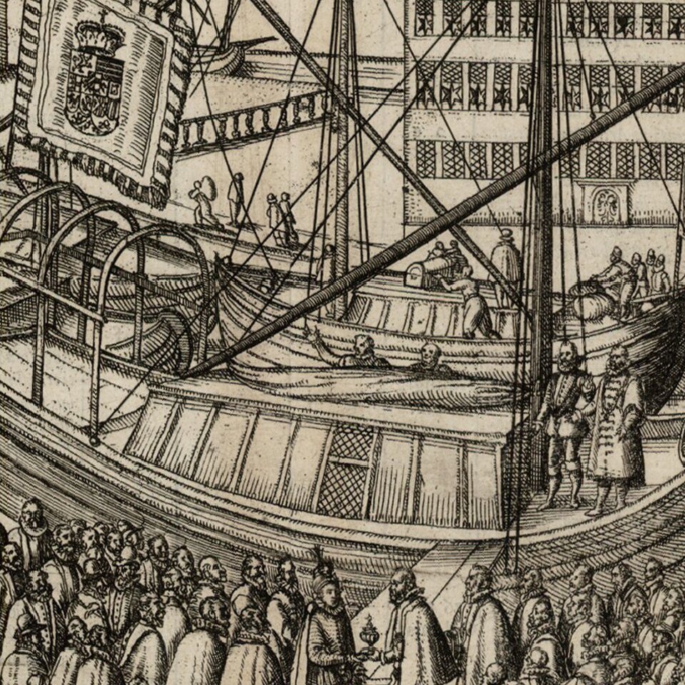 Antique engraving of the departure of Archduke Matthew from the Netherlands, 29 October 1581; Archduke Matthew and entourage are depicted embarking on their ships.