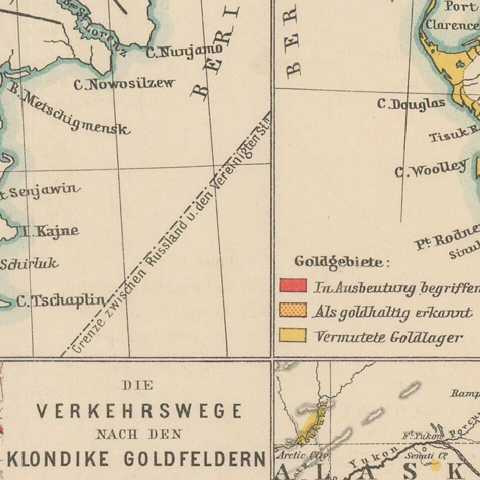 Fine set of four maps, highlighting the gold regions in Alaska and the Behring Straits, published by A.H. Petermann.