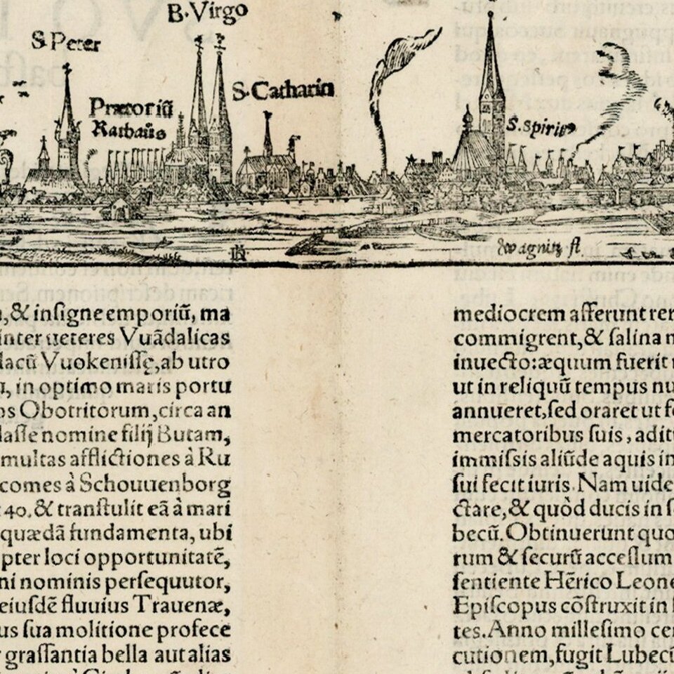 Early double page birdseye view of the city of Lubeck, with Heraldic images in the sky.