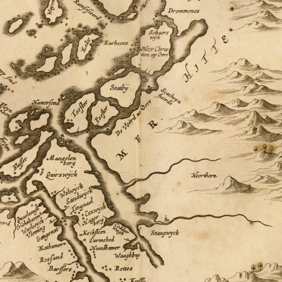 Scarce map of the Southern part of the Diocese of Trondheim in Norway, first published by Jan Jansson in Amsterdam for his Atlas Major.