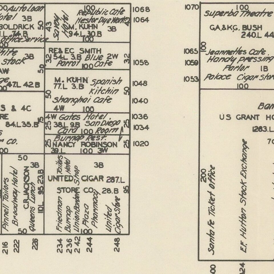 Nirenstein's map provided a highly detailed report of the Urban Core of San Diego, showing block by block the lots and businesses and stores in operation on the eve of the Crash.
