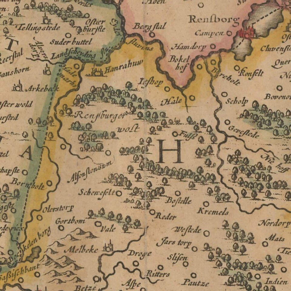 Old color example of Henricus Hondius' map of the Duchy of Holstein.