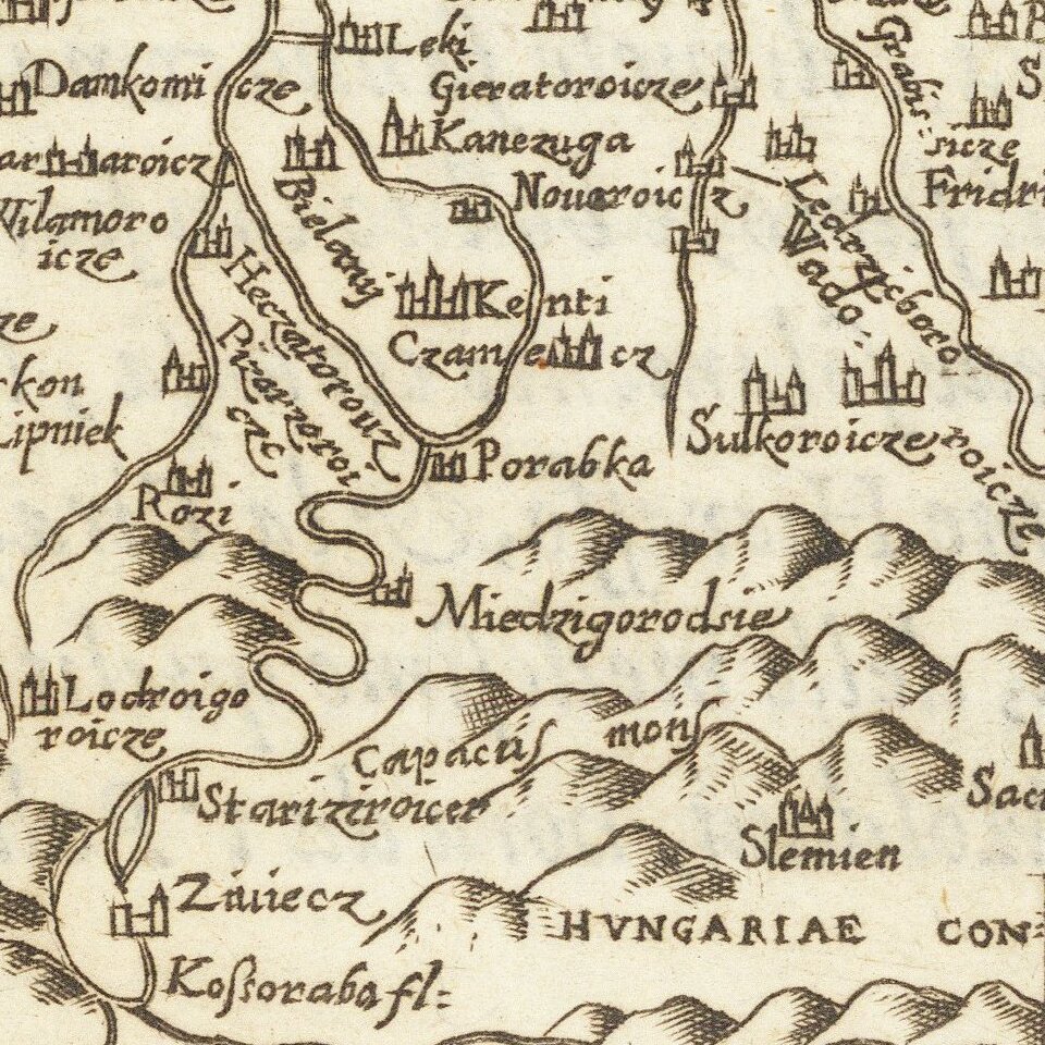 The towns of Zatoriensis [Zator] and Osroiczensis [Oswiecim] give their name to the title of this map and other prominent cities of the region can be located, including present-day Bielsko-Biala and Skoczow. The Duchy of Oswiecim dates back to the fragmentation of Poland in the 14th century, and it was split into several smaller duchies, including the Duchy of Zator in 1445. The Duchies would be rejoined with Poland shortly after, and these lands would remain Polish until the First Partition in 1772.