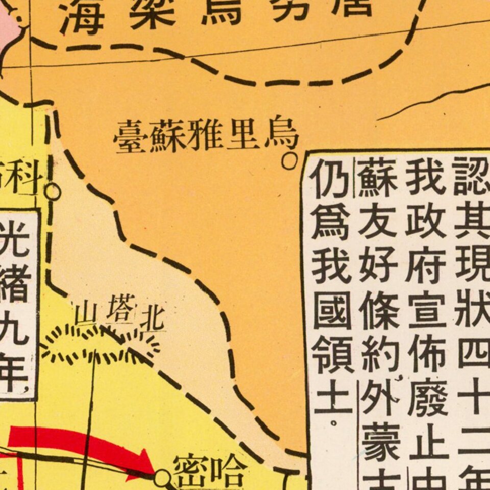 The pink region is labeled in the legend as “losses during the Manchu Qing Era.” The orange region is labeled “losses during the Republican Era.” The tan area is provocatively labeled “territories arbitrarily severed by communist bandits [outer Mongolia].” The white box explaining this concession points to the Sino-Soviet Treaty of Friendship (1953), which “gave away our country’s national territory.”