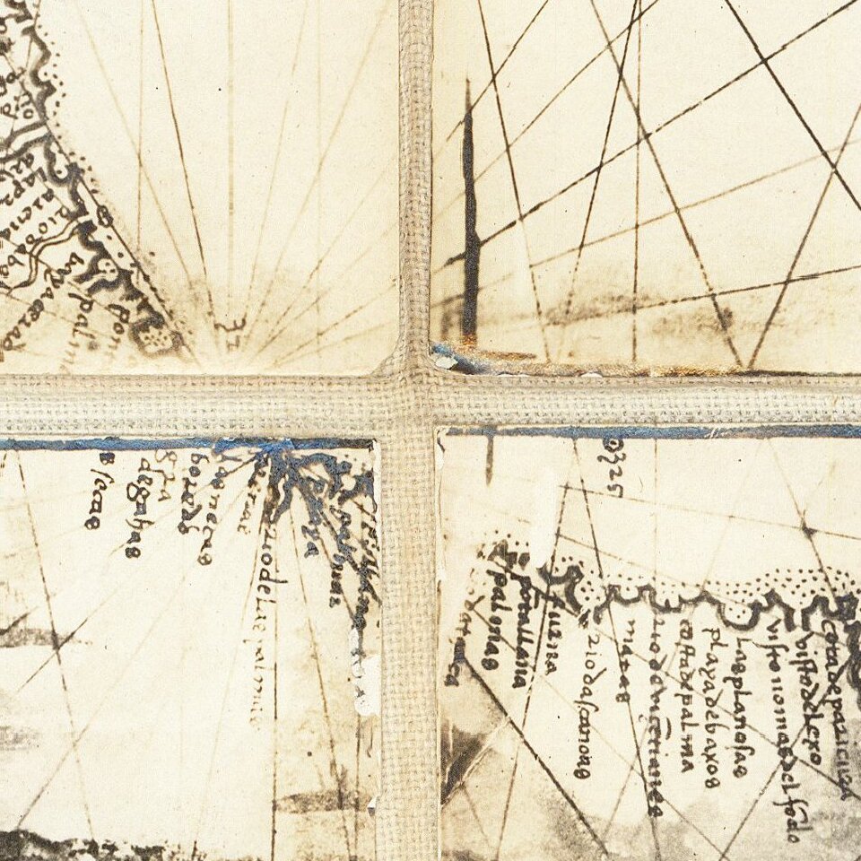 This large map is attributed to Giovanni [Juan] Vespucci, born in Florence in 1486, who was the nephew of the great navigator Amerigo Vespucci. The latter, who collaborated in 1512 by Juan Diaz de Solis, pilot major of the Casa de la contratación Seville which was responsible for forming the new map Oficial del Estado (Padrón real), and he became pilot major in 1513; in 1515 it was part of the junta in charge of correcting the navigation chart (carta de navegar) as a result of the review of Raya, the line found after the bull of Pope Alexander VI sent to the Spanish royal May 4, 1493 (the Treaty of Tordesillas), which established the division of the world into two spheres of influence, Spanish and Portuguese. The Geocarta Nautica Universale [Great Universal Maritime Chart], as defined in the recording inventory) is the first known map, drawn before the Junta de Badajoz (before 1524), which takes into account the results of the circumnavigation of the globe by Magellan’s expedition (1522); therefore it is the first map that shows the complete representation of the Pacific Ocean.