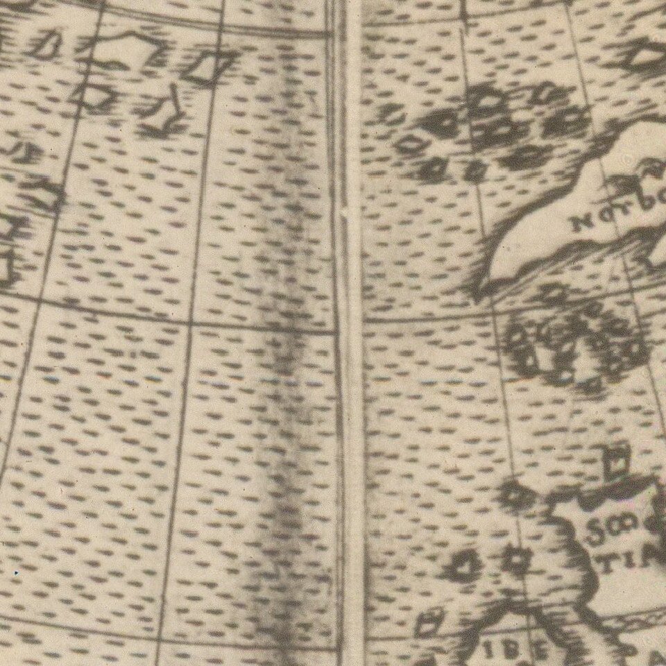 For the first time on a map the newly-discovered relationship between the east and the west parts of the world is set out. The breadth of the Pacific Ocean remains too small compared to the rest of the world and it is still assumed that North America is an easterly extension of Asia. This large promontary, stretching across what is now the north Atlantic, is marked as being part of the province of Tangut, mentioned by Marco Polo. Off its eastern tip (where now is Newfoundland) an inscription refers to the land discovered by the seamen of Portugal - a reference to the exploration of the Corte-Reals in 1500 and 1501. The West Indian islands are shown in detail as ' ... the islands which Master Christopher Columbus discovered at the instance of the most serene King of Spain.' No coastline is marked west of Cuba, implying that Contarini chose to ignore Vespucci's alleged voyages in this area in 1497. To the south, present-day South America is separated from North America by a wide strait but its northern coast is plotted in detail, based on the discoveries of Columbus in 1498 and Amerigo Vespucci in 1499-1500. To the southwest and south-east undiscovered land extends to the map's limits. However, a large legend off the coast of Asia refers to Columbus' last voyage (of 1502-1504) and his having reached Ciamba, searching for gold. Whether this relates to the province of Cianba, marked on the mainland of Asia, or perhaps indirectly to the island of Zinpangu (Japan) in the middle of the Pacific, is not clear.