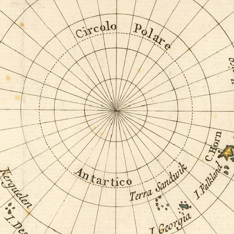 The map shows the Southern Hemisphere prior to the first discoveries in Antarctica, but shortly after the Voyages of Captain James Cook established a more accurately known coastline for New Zealand.