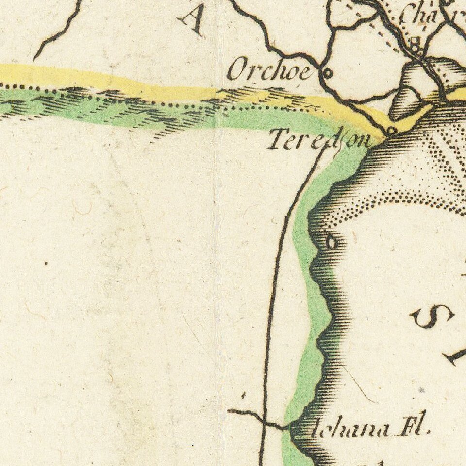 Didier Robert de Vaugondy (ca. 1723-1786) was the son of prominent geographer Gilles Robert de Vaugondy and Didier carried on his father’s impressive work. Together, they published their best-known work, the Atlas Universel (1757). The atlas took fifteen years to create and was released in a folio and ¾ folio edition; both are rare and highly sought-after today. Together and individually, father and son were known for their exactitude and depth of research.