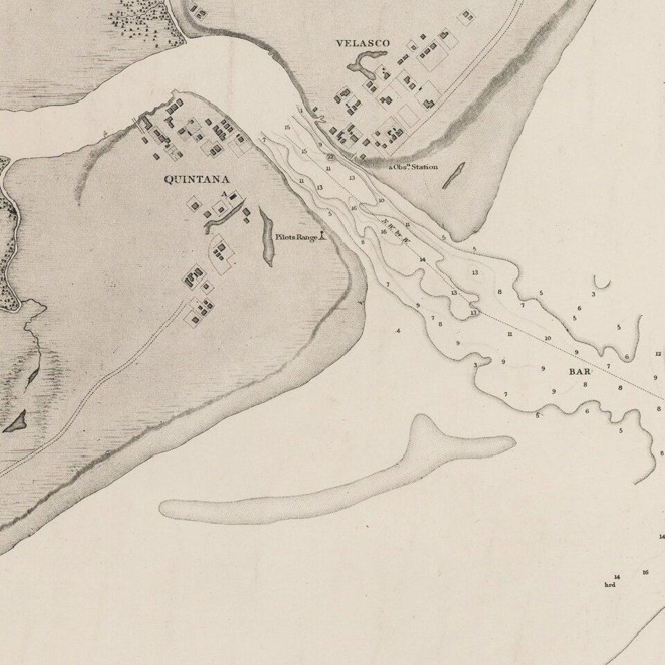 The mouth of the river includes the towns of Velasco and Quintana, including an Observation Station and PIlots Range and extensive soundings.