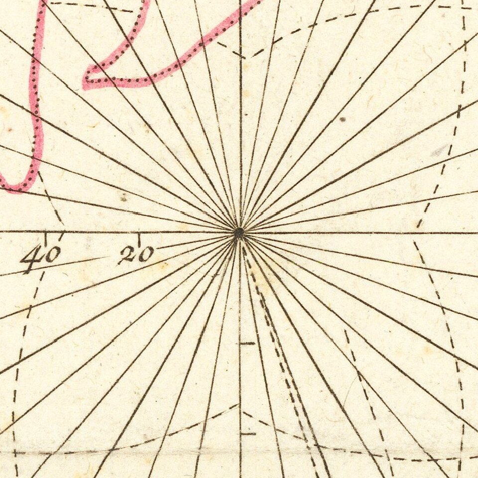 Convinced that there was no reliably persuasive evidence of a watercourse through the continent, De Vaugondy focused his presentation to the Academy on possible polar routes. He also presented for the first time in the now two decade old controversy, a polar projection map intended to illustrate his hypotheses on the practicable sailing routes. As noted by Mary Pedley in Bel et Utile: