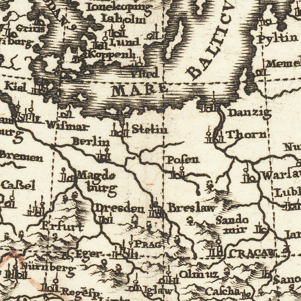Decorative map Europe, Iceland and part of Greenland, with sea monsters and land creatures in the sea and on land.