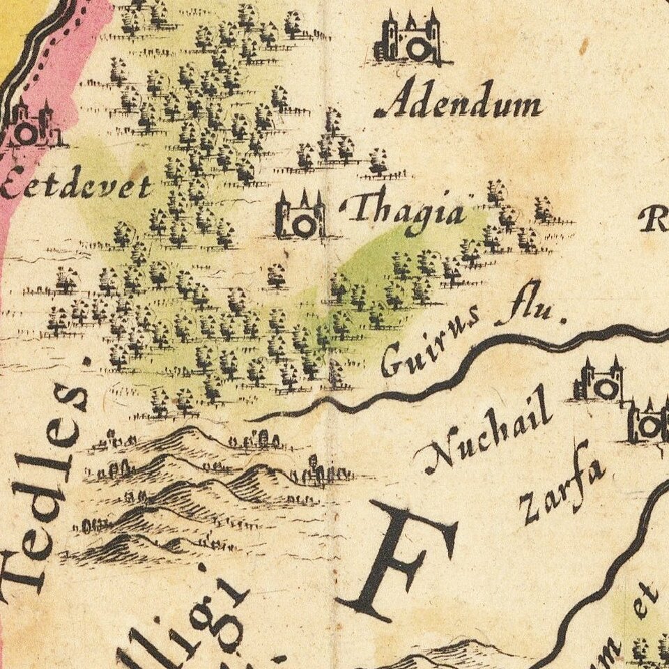 A striking map of Morocco, showing large fortified towns of Marrakesh, Taradante and Fez, towns, mountains, rivers, lakes, etc. Tanger, Cueta and Rio Rabata also appear.