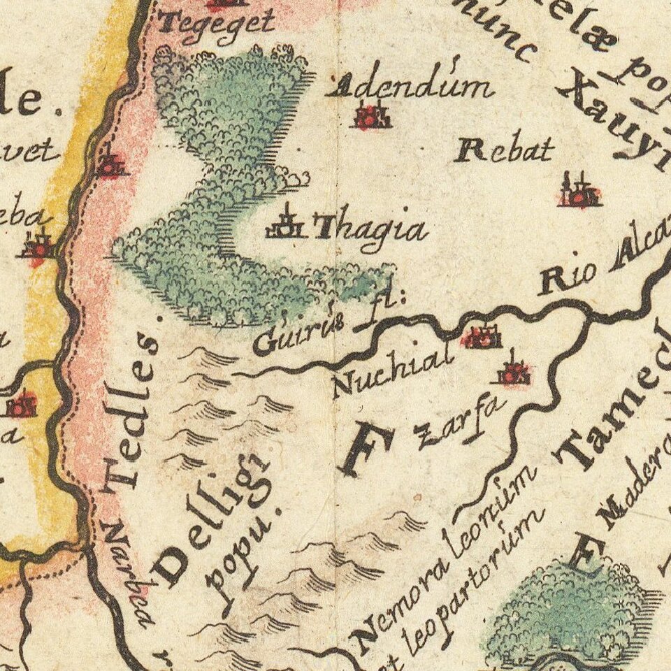 A striking map of Morocco, showing large fortified towns of Marrakesh, Taroudant and Fez, towns, mountains, rivers, lakes, etc.