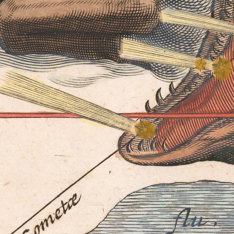 Rare celestial map showing figural representations of the constellations and the stars of which they are composed. The progress of the Great Comet of 1664 through this area of the sky is demarcated, The transit begins below Capricorn and ending to the right of Aries.