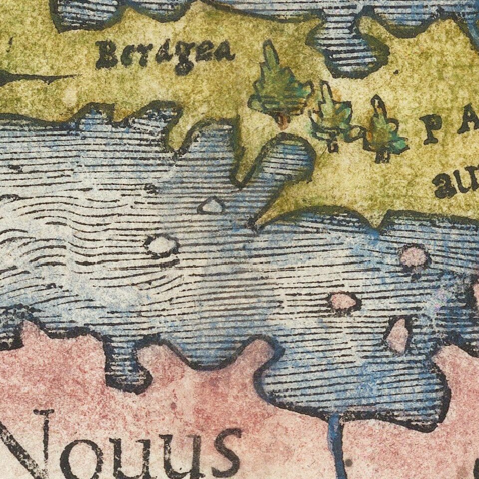 Münster’s depiction of this misconception in the present map derives from Verrazzano’s 1524 voyage. As he passed the Outer Banks of present-day North Carolina, Verrazzano thought he saw a vast “oriental sea,” sometimes referred to as the Sea of Verrazzano, leading to Cathay and the Spice Islands. What he likely saw was the long sandbar from the Pamlico to Albemarle Sounds. This misconception is depicted in several sixteenth-century European maps, including Münster’s.