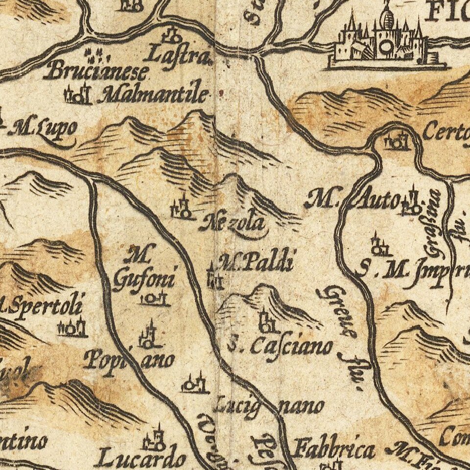 The map is based upon Stefano Buonsignori's map of Florence and surroundings, engraved in 1584 by Domenico Vito. The map was sent to Ortelius by Marcarius in late 1594 or early 1595, as there exists a letter from Marcarius to Ortelius dated March 1595 which inquires whether Ortelius had received the map. The map identifies Stephanus Monachus of Orivieti, as the maker.