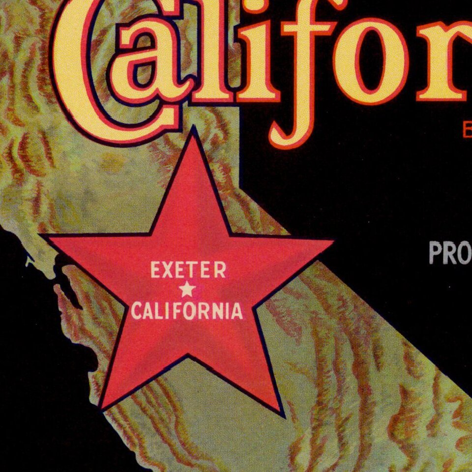 Decorative Fruit Crate Label map of California, promoting Exeter Orange Growers.