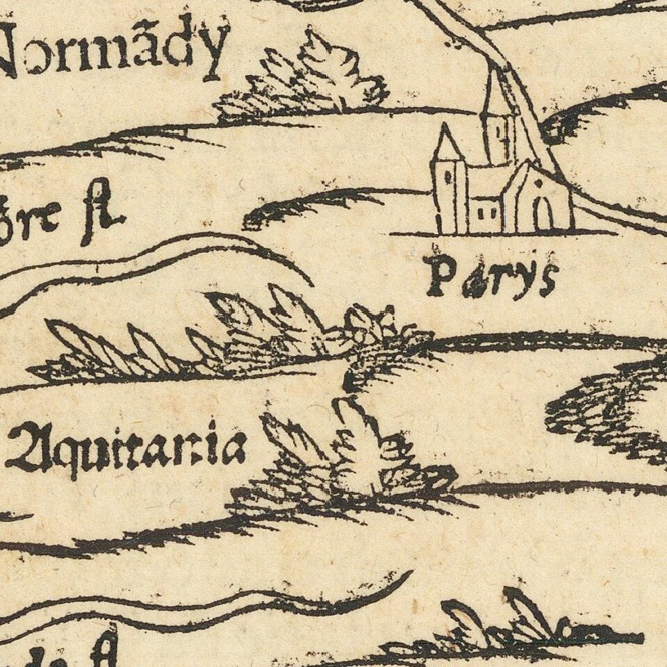 Interesting early map of France, using a stylized hill format which was popularized in maps of the 15th Century.