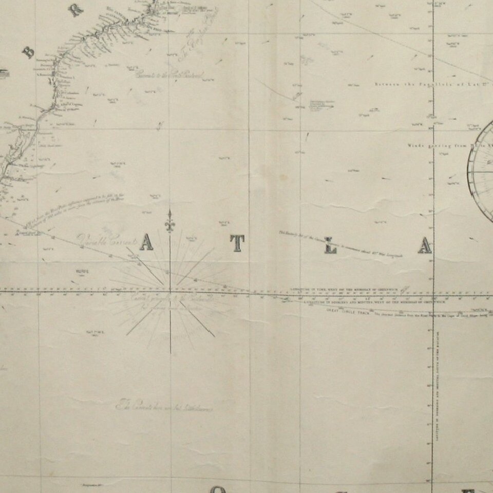 Fine working sea chart of the South Atlantic, showing the parts of South America and Africa in the Southern Hemisphere.
