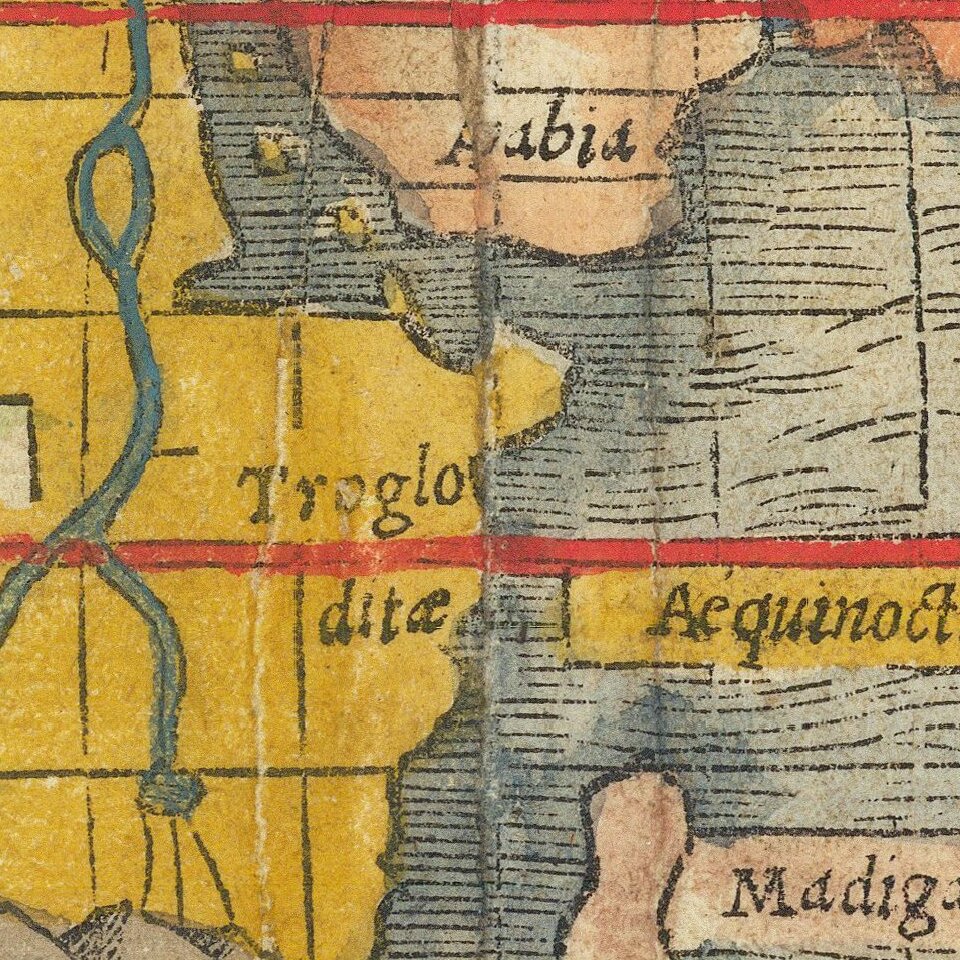 The map is based upon a mix of information derived from Verrazano's explorations (1522-24), which mistook the Chesapeake for the Pacific Ocean, and Cartier's voyages (1534-35) up the St. Lawrence in search of the Northwest Passage. The west coast of America appears on the right side of the map. This is also the 1st map to name the Pacific Ocean (Mare Pacificum). Munster is non-committal as to the continuity of North and South America, an unbroken Central America being implied but not clearly shown. Though unnamed, Terra Australis is present but small, only serving to form the Magellan Strait.