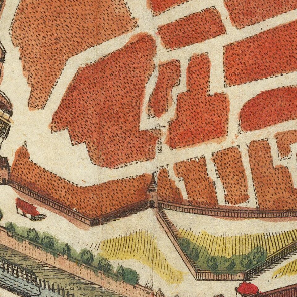 Decorative plan of Geneva, Switzerland and the Rosne River, including the entrance to Lake Geneva, published by Merian.