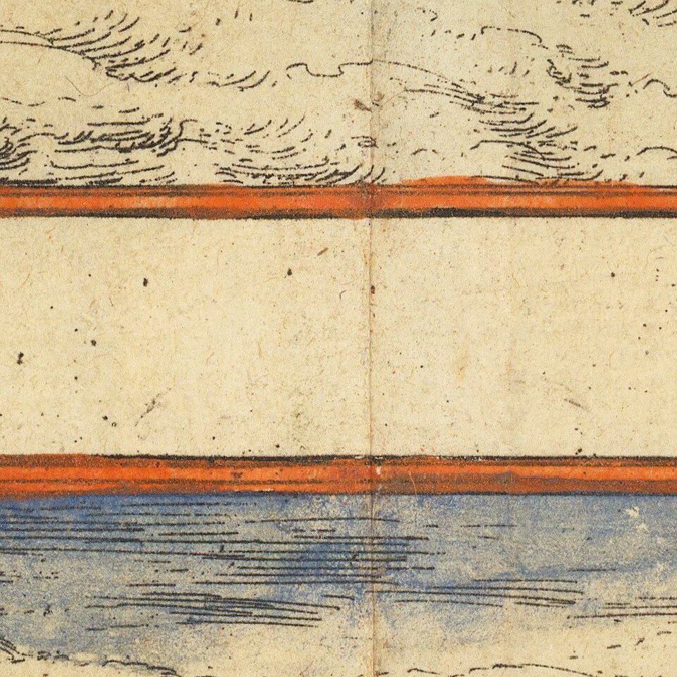 In Florence, we see that the city on the banks of the Arno has spread out to fill the city walls, which were in their sixth iteration by then. The Belvedere fort is seen overlooking the city from the south, something not always included in maps of Florence. Many additional landmarks are instantly recognizable, from the Catedral de Santa Maria to the Palazzo Vecchio. In the background are the Tuscan hills, dotted with small villages. Two wealthy travelers venture towards the city in the foreground. Despite the remarkable nature of most of this work, one small oversight of perspective is made: the peasants tilling their crops are significantly too large to fit in the houses they occupy.