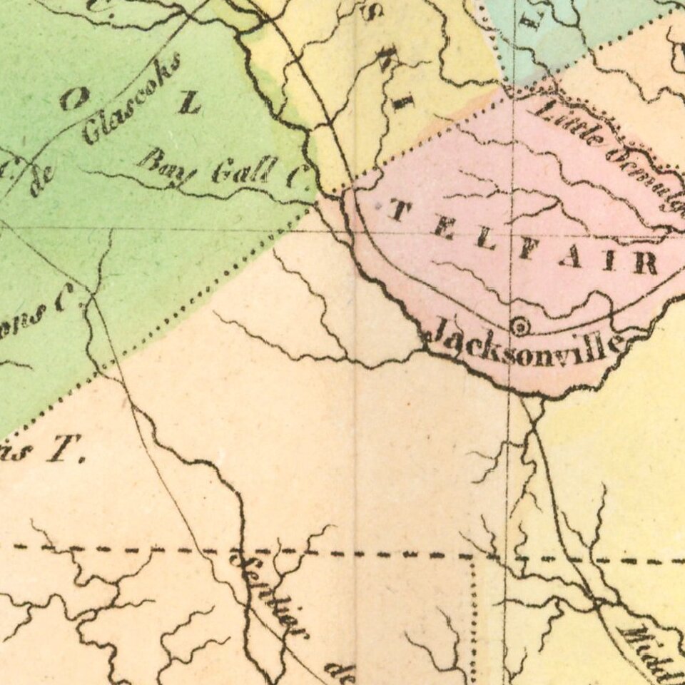 Detailed map of Georgia, based upon the 1822 map by Carey & Lea. The western counties are still unformed and classified as Indian lands, including the Cherokis and Lower Creek. Massive Appeling, Irwin and Early Counties dominate the south and are noted as being Indian Territories pursuant to the treaty of Ft. Jackson. The map shows counties, towns, roads, rivers, etc.