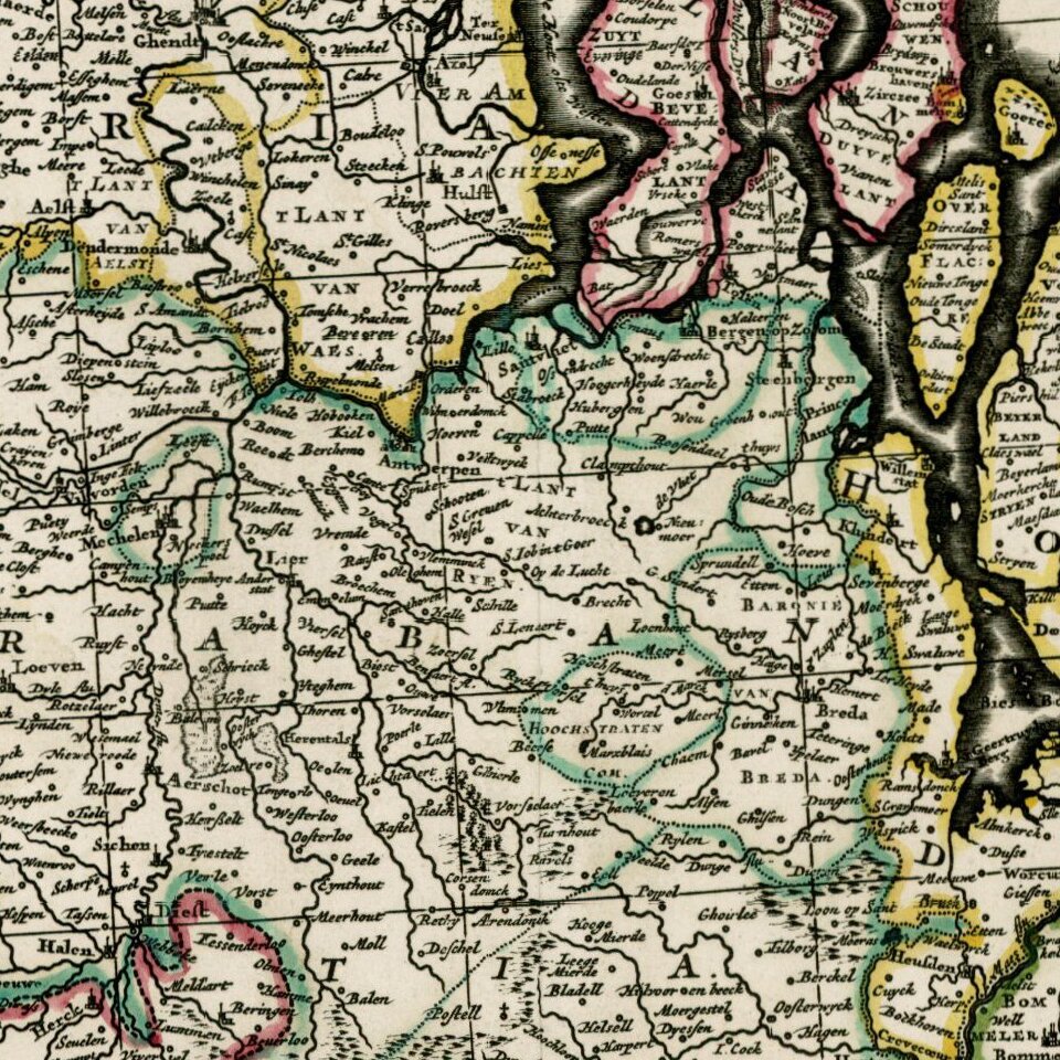 Scarce Visscher map of the low countries, with decorative cartouche and decorative key, including coat of arms.